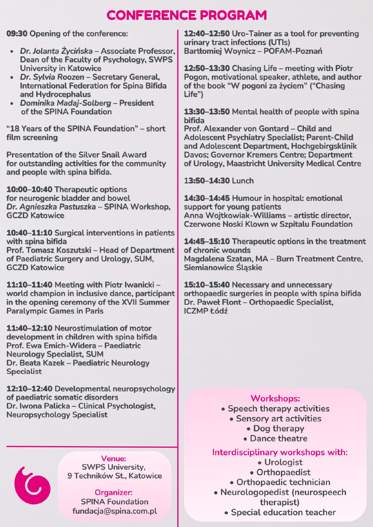 On 20 September 2025, Spina Foundation, Poland, organised a conference with lectures and workshops, as well as therapeutic, dance, and artistic activities for small and older children.